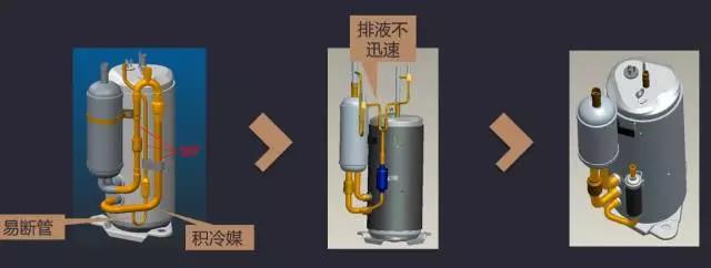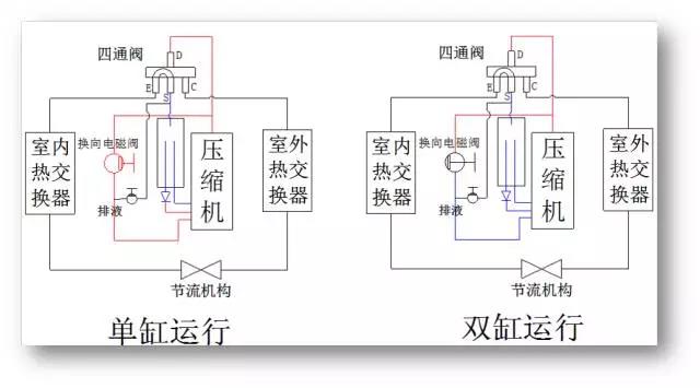 單缸運行時下氣缸連接管和排氣管相連且無冷媒流動,長期運行時會造成積冷媒,若此時切換雙缸運行,該堆積的冷媒會直接被吸入下氣缸造成壓縮機液擊。